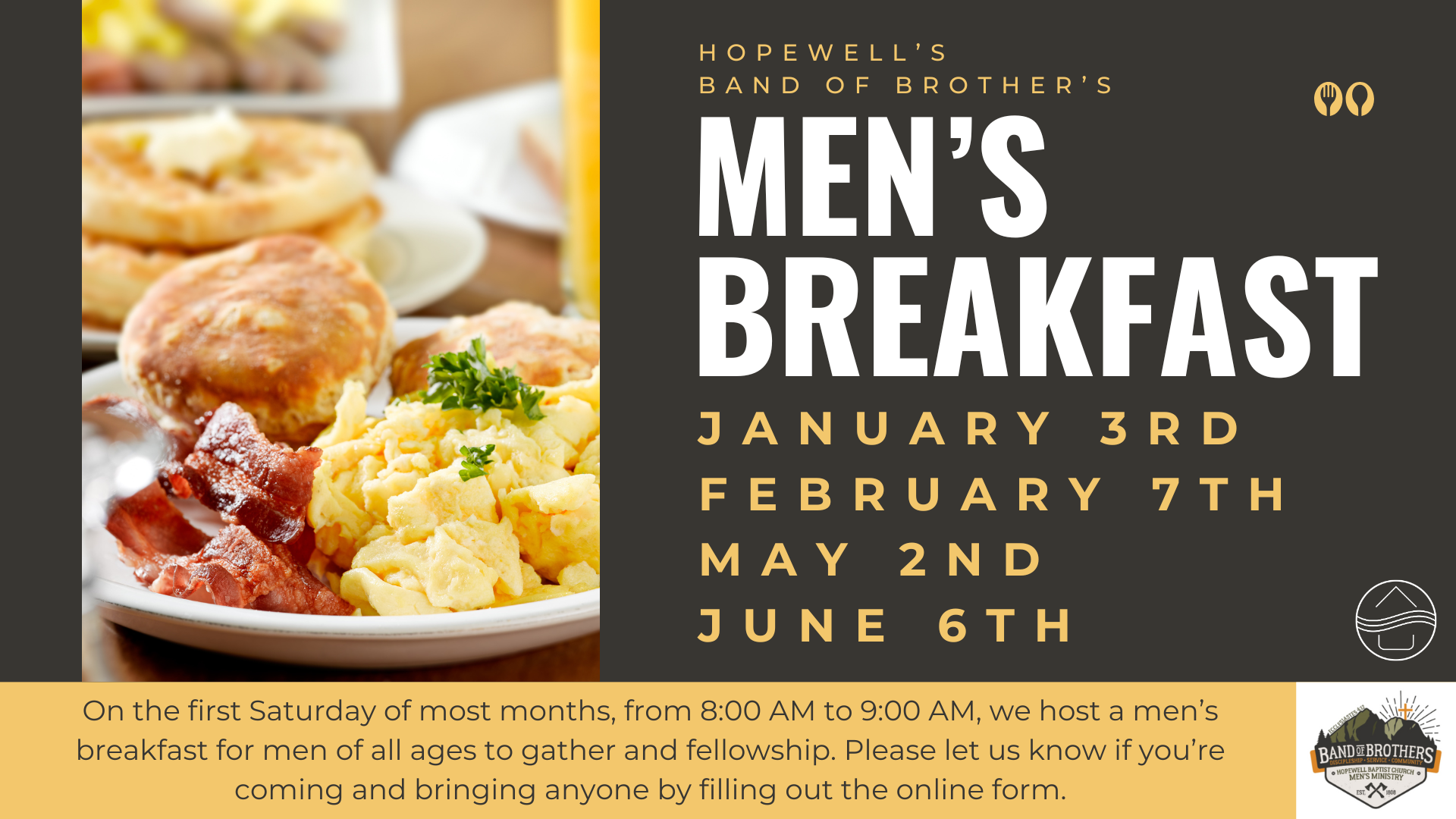 Our next Men’s Breakfast will be on January 3rd, 2026, for men of all ages to get together and have fellowship! Registration is so that we can get a headcount for food beforehand.